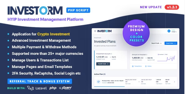 Investorm – Advanced HYIP Investment Management Platform Extended Licence + All Modules & Addons v1.5.0